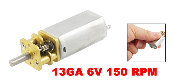Product Name DC Geared Motor Rated Voltage DC 6V Rated Current 13GA ( no load ) Speed 150 RPM Shaft Diameter 3mm/ 0.118" Gearbox Size 26 x 12 x 16mm/ 1" x 0.47" x 0.6"(L*W*T) Total Length 51mm/ 2" Main Color Silver Tone, Gold Tone Material Metal Weight 23g Package 1 x DC Geared Motor  - Reviews