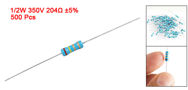 Product Name Carbon Film Resistors Rating Power 1/2W Resistance 204 Ohm Resistance Tolerance ± 5% Withstand Voltage 350V Size(Not Include Leads) 0.6 x 0.25cm / 0.236" x 0.098"(L*D) Leads Dia(Approx) 0.03cm / 0.012" Overall Length(Approx) 5.6cm / 2.2" Color See the Picture Weight 123g Package Content 500(±2%) Pcs of Carbon Film Resistors - Reviews