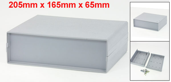 Details205mm x 165mm x 65mm Plastic Enclosure Case DIY Junction Box  Product Name Junction Box Mounted Type Surface Mounted Total Size 205 x 165 x 65mm/8.1" x 6.5" x 2.6"(L*W*H) Internal Size 198 x 148 x 60mm/ 7.8" x 5.8" x 2.4"(L*W*H) Fixing Hole Diameter 4mm/0.16" Fixing Hole Center Distance 183 x 82mm/7.2" x 3.2"(L*W) Material Plastic Color Gray Net Weight 331g Package 1 x Junction Box