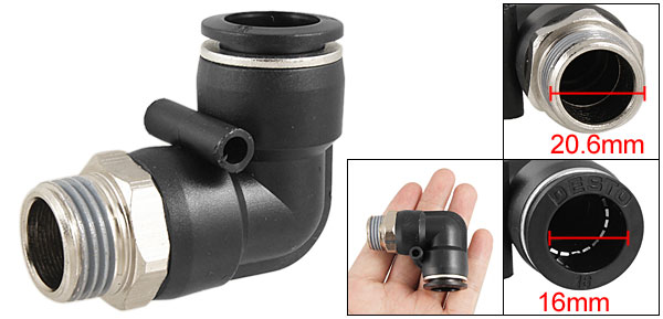 Product Name Pneumatic Fitting Model DPL16-04 Tube OD 16mm / 0.630" Thread OD 20.6mm / 0.811" Total Size(Approx) 57 x 26 x 46mm / 2.2" x 1" x 1.8"(L*W*H) External Material Plastic & Metal Color Black & Silver Tone Net Weight 52g Package Content 1 x Pneumatic Fitting - Reviews