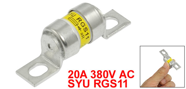 Product Name Bolt Connected Fuse Model SYU RGS11 Type Fast Blow Material Metal Rated Voltage 380V Rated Current 20A Main Color Silver Tone Total Size 56 x 17mm / 2.2" x 0.67" (L*D) Hole Size 8.2 x5.8mm / 0.3"x 0.2" (L*W) Weight 24g Package Content 1 x Bolt Connected Fuse - Reviews