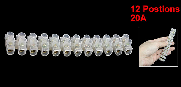 Product Name Barrier Terminal Block Material(external) Plastic Color Clear White Type 12 Positions, 2 Rows Current 20A Cable Entry Diameter 4mm/0.16" Size 120 x 19 x 14mm/4.7" x 0.7" x 0.6" (L*W*H) Weight 27g Package Content 1 x Barrier Terminal Block - Reviews