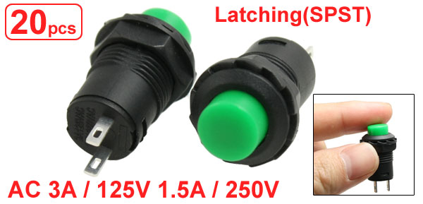 Product Name Push Button Switch Action Type Latching Contact Type NO Poles SPST Rating Voltage AC 3A / 125V; 1.5A / 250V Terminals Quanlity 2 Pins Mounting Hole Size 12 x 24mm / 0.47" x 0.94"(D*T) Button Diameter 9mm / 0.35" Terminals Pitch 5.5mm / 0.22" Overall Size 16 x 30mm / 0.63" x 1.2"(Max.D* T) Material Plastic & Metal Color Green & Black Weight 56g Package Content 20 x SPST Push Button Switch - Reviews