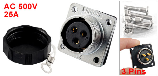 Product Name Aviation Connector Plug Model WS20-3 Contacts Pin Number 3 Contacts Pin Diameter 2.5mm Rated Voltage AC 500V Rated Current 25A Test Voltage(AC 1 min) 1500V Contact Resistance 1 Ohm Insulation Resistance 2000M Ohm Base Diameter 20mm/ 0.787" Thread Diameter 21.5mm/ 0.846" Overall Size 27 x 29mm/ 1.1" x 1.1"(L*Max.W) Screw Hole Dia 3mm/ 0.118" Material Aluminum, Rubber Color Silver Tone, Black Weight 38g Package 1 x Aviation Connector Plug