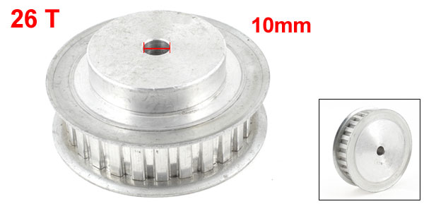 Product Name Timing Pulley Type L26 Number of Tooth 26 Pitch 8mm/ 3/10'' Bore Diameter 10mm/ 2/5" Fit Belt Width 20mm/ 0.79'' Overall Size 90 x 39mm/ 3.5'' x 1.5''(D*H) Material Alloy Color Silver Tone Weight 441g Package Content 1 x Timing Pulley  - Reviews