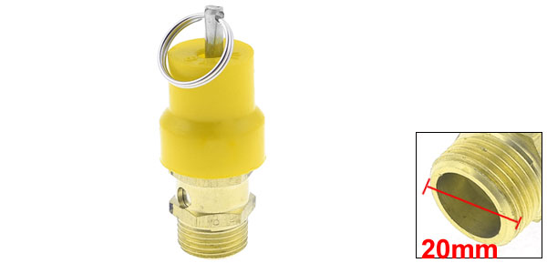 Details20mm Dia Thread 10 Bar Plastic Metal Air Pressure Relief Valve  Product Name Pressure Relief Valve Material Plastic, Metal Color Yellow, Gold Tone Working Pressure 10 Bar Thread Diameter 20mm Valve Total Size 4.7 x 2.3cm / 1 6/7" x 9/10" (L*Max.D) Weight 45g Package Content 1 x Pressure Relief Valve