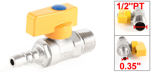 Product Name Gas Ball Valve Thread Diameter 20mm/1/2''PT Hose Tail Diameter 9mm/0.35'' Level Handle Size 44 x 22mm/1.7'' x 0.87'' (L*W) Overall Size 79 x49 x 23mm/3' x 1.9'' x 0.9'' (L*W*Max.T) Color Silver Tone, Yellow Main Material Brass Weight 131g Package 1 x Ball Valve - Reviews