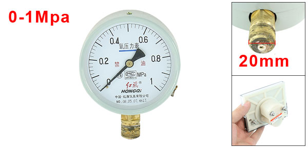 Product Name Oxygen Pressure Gauge Scale Range 0-1Mpa Accuracy Class 1.6 Dial Size 10 x 4.5cm /4" x 1.8" (L*W*T) Thread Size 20 x 1.5mm/0.8" x 0.6" (D*Pitch) External Material Metal Color White, Clear Net Weight 390g Package Content 1 x Oxygen Pressure Gauge - Reviews