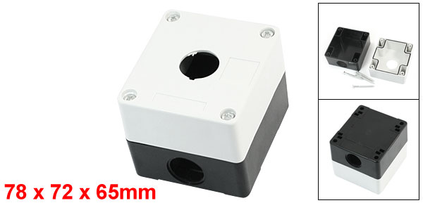 Product Name Push Button Switch Box Fixing Hole Diameter 5mm/ 0.2" Wire Outlet Dia 20mm/0.8" Overall Size 78 x 72 x 65mm/ 3.1" x 2.8" x 2.6" (L*W*T) External Material Plastic Color White, Black Total Weight 114g Net Weight 100g Package Content 1 x Push Button Switch Box