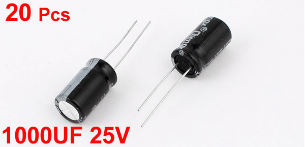 Product Name Polarised Aluminium Electrolytic Capacitor Type Radial Leads Temperature Range -40~+105°C Voltage 25V Capacitance 1000uF Body Size 10 x 17mm/0.4" x 0.67"(D*H) Lead Space 4.5mm/0.18" Lead Length 20mm/0.8" , 25mm/1" External Material Aluminum Total Net Weight 42g Main Color Black Package Content 20PCS x Electrolytic Capacitors - Reviews