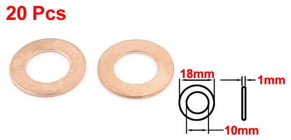 Details20Pcs 10mmx18mmx1mm Copper Crush Washer Flat Oil Seal Ring Gasket  Product Name Copper Washer Inner Diameter 10mm/0.4" Outer Diameter 18mm/0.71" Thickness 1mm/0.04" Material Copper Color Copper Tone Weight 29g Package Content 20 Pcs x Copper Washer
