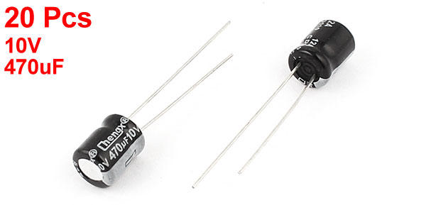 Product Name Electrolytic Capacitor Type Radial Leads Temperature Range -40~+105C Voltage 10V Capacitance 470uF Body Size 6.3 x 8mm/0.25" x 0.3"(D*H) Lead Space 2.5mm/0.1" Lead Length 21mm/0.8" , 26mm/1" External Material Aluminum Total Net Weight 10g Main Color Black Package Content 20 x Electrolytic Capacitors - Reviews