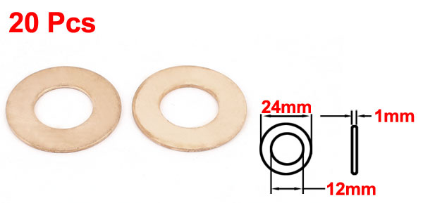 Product Name Copper Washer Total Size 12 x 24 x 1mm/0.5" x 0.9" x 0.04"(Inner Dia*OD*T) Material Copper Color Copper Tone Net Weight 54g Package Content 20 x Copper Washers - Reviews
