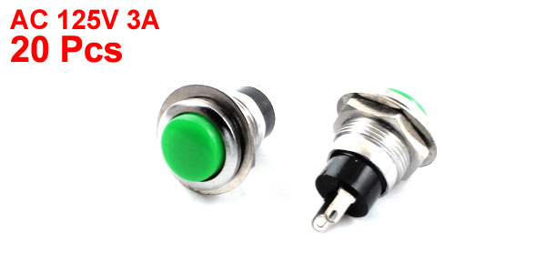 Main Color Green, Silver Tone Thread Dia 12mm Country of Manufacture CHINA Actuator Type Momentary Material Plastic, Metal Contact Type SPST NO Total Size 18.5 x 17mm/0.73" x 0.67"(D*H) Button Dia 10mm Product Name Push Button Switch Pins 2 Net Weight 115g Rated AC 125V 3A Package Content 20 Pcs x Push Button Switch - Reviews