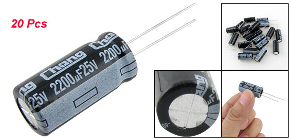 Product Name Aluminum Electrolytic Capacitor Type Radial Lead Quantity 20 Pcs Maximum Temperature 105°C Voltage 25V Capacitance 2200uF Capacitance Tolerance ±20% Body Size 12 x 25mm/ 0.47'' x 1'' (D*L) Lead Spacing 5mm/ 0.2'' Lead Length 26mm/ 1.02'', 23mm/ 0.9'' External Material Aluminum Weight 85g Color As Picture Shown Package Content 20 Pcs x Electrolytic Capacitors - Reviews