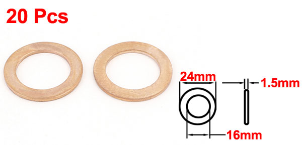 Product Name Copper Washer Total Size 16 x 24 x 1.5mm/0.64" x 0.9" x 0.06"(Inner Dia*OD*T) Material Copper Color Copper Tone Net Weight 60g Package Content 20 x Copper Washers - Reviews
