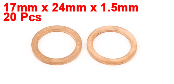 Details20pcs 17mmx24mmx1.5mm Industrial Copper Flat Washer Gasket Seal Fitting Fastener  Product Name Copper Washer Total Size 17 x 24 x 1.5mm/0.67" x 0.94" x 0.06"(Inner Dia*OD*T) Material Copper Color Copper Tone Net Weight 51g Package Content 20 x Copper Washers