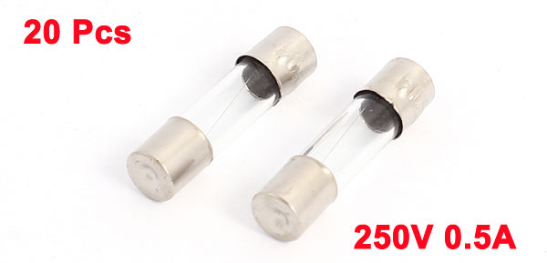 Product Name Glass Tube Fuses Quantity 20 Features Fast Blow(F) Low Breaking Capacity(L) Rated Voltage 250V Rated Current 0.5A Body Size 5 x 20mm/ 0.2" x 0.8"(D*L) Material Glass, Metal Color Silver Tone, Clear Weight 13g Package 20 Pcs x Glass Tube Fuses - Reviews