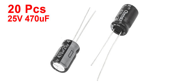 Product Name Polarised Aluminium Electrolytic Capacitor Type Radial Leads Temperature Range -40~+105°C Voltage 25V Capacitance 470uF Body Size 8 x 12mm/0.3" x 0.47"(D*H) Lead Space 3mm/0.12" Lead Length 22mm/0.85" , 26mm/1" External Material Aluminum Total Net Weight 22g Main Color Black Package Content 20PCS x Electrolytic Capacitors - Reviews