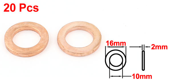 Product Name Copper Washer Total Size 10 x 16 x 2mm/0.4" x 0.63" x 0.08"(Inner Dia*OD*T) Material Copper Color Copper Tone Net Weight 39g Package Content 20 x Copper Washers - Reviews