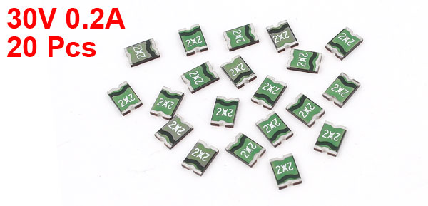 Product Name SMD Resettable Fuse Type 2x2 Features Fast Blow(F) Low Breaking Capacity(L) Package Type SMD1812 Size 5 x 3 x 0.6mm/0.2" x 0.12" x 0.024"(L*W*T) Max. Voltage 30V Max. Current 0.2A External Material Epoxy, Glass Substrate Color Green, Silver Tone Net Weight 2g Package Content 20 Pcs x SMD Resettable Fuses - Reviews