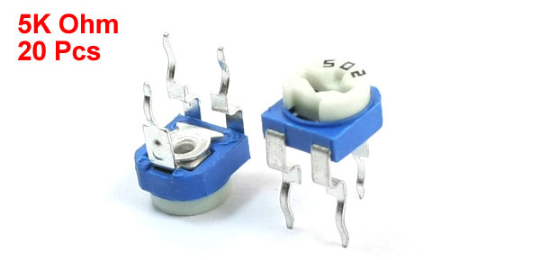 Product Name Variable Resistor Trimmer Potentiometer Resistance Value 5K Ohm Resistive Material Metal, Plastic Body Size (Approx.) 7 x 6.5 x 4mm / 0.28" x 0.26" x 0.16"(L*W*T) Pin Size (Each) 8 x 0.5mm / 0.31" x 0.02" (L*Tip Width) Color White, Blue, Silver Tone Weight 5g Package Content 20 x Variable Resistor Trimmer Potentiometer - Reviews