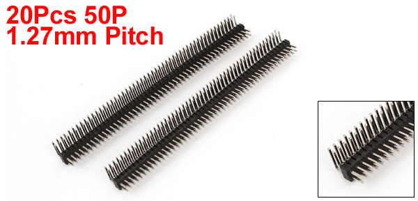 Product Name Pin Header Pin Count 50 Type Double Row Mounting Angle 90° Pin Pitch 1.27mm Total Size 63 x 7 x 5mm/ 2.5" x 0.28" x 0.2"L*W*H) Material Plastic, Metal Color Black, Gold Tone Weight 36g Package Content 20 x Pin Header - Reviews