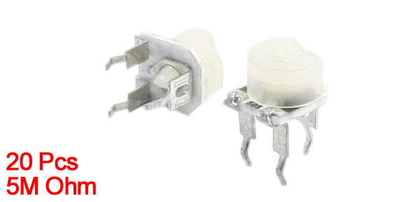 Product Name Variable Resistor Trimmer Potentiometer Resistance Value 5M Ohm Resistive Material Metal, Plastic Body Size (Approx.) 8 x 7 x 6.5mm / 0.31" x 0.28" x 0.26"(L*W*T) Pin Size (Each) 7 x 0.8mm / 0.28" x 0.03" (L*Tip Width) Color White, Silver Tone Weight 5g Package Content 20 x Variable Resistor Trimmer Potentiometers - Reviews