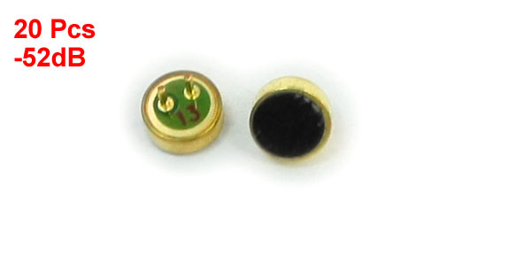 Product Name Omni-Directional Electret Condenser Microphone Sound Channel Number Stereo Output Impedence 2kOhm Frequency Response 20kHz Microphone Unit 4015 Sensitivity -52dB Body Size 4 x 1.5mm / 0.16" x 0.06" (D*T) Pin Pitch 1mm / 0.04" External Material ABS Main Color Gold Tone Weight 2g Package Content 20 x Omni-Directional Electret Condenser Microphone