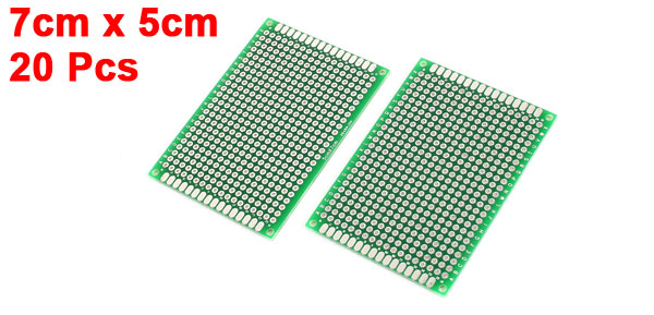 Details20Pcs 5cm x 7cm Dual Sides Prototype Paper Universal Tinned PCB Circuit Board  Product Name Universal PCB Board Hole Dia(Approx) 1mm / 0.039" Hole Pitch(Approx) 2.54mm / 0.1" Size(Approx) 5 x 7cm /2" x 2.8"(W*L) Thickness(Approx) 1.6mm / 0.063“ Install Hole Dia 2mm/0.08" Install Hole Distance 6.6 x 4.6cm/2.6" x 1.8"(L*W) Material FR-4, Tin Color Green, Silver Tone Net Weight 212g Package Content 20 x Universal PCB Board