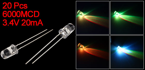 20Pcs 5mm Round Head Multicolor LED Bulbs Emitting Diode 6000MCD 3.4V 20mA