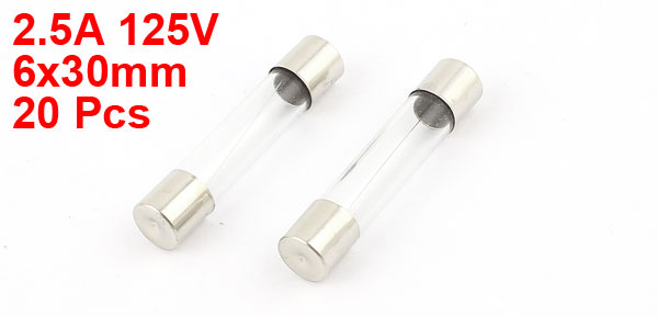 Details20pcs 6x30mm Quick Blow Fast Acting Low Break Capacity Glass Tube Fuse 2.5A 125V  Product Name Quick Blow Glass Tube Fuses Features Fast Blow(F) Low Breaking Capacity(L) Rated Current 125V Rated Current 2.5A Body Size 6 x 30mm/ 0.24" x 1.2"(D*L) Material Glass, Metal Color Silver Tone, Clear Weight 23g Package 20 x Quick Blow Glass Tube Fuses