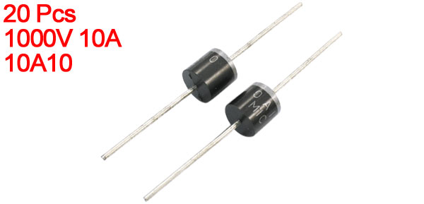 Product Name Rectifier Diode Model 10A10 Forward Current 10A Max Peak Reverse Voltage 1000V Lead Size 1.2 x 27mm/ 0.04" x 1"(D*L) Body Size 9 x 9mm/ 0.35" x 0.36" (D*L) Main Color Black, Silver Tone Weight 34g Package Content 20 Pcs x Rectifier Diodes - Reviews