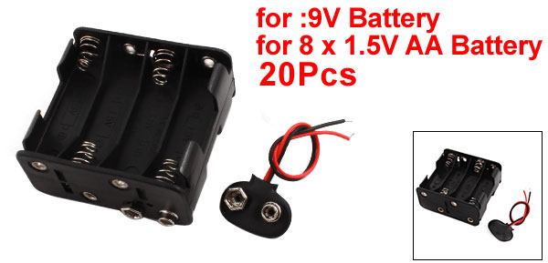 Details20Pcs 9V Battery Clip Connector Lead + 2pcs 8 x 1.5V AA Battery Holder Case  Product Name Battery Connector+Battery Holder Fit for 9V Battery(Battery Not Include) Size 2.7 x 2 x 0.5 cm / 1.1" x 0.8" x 0.2" (L*W*T) Cable Length 11cm / 4.3" Battery Holder Fit for for 8 x 1.5V AA Battery (not included here) Material Faux Leather, Metal Battery Holder Size 6.2 x 5.8 x 3cm/ 2.4" x 2.3" x 1.2"( L*W*H ) Color Black, Red Weight 08484g Package Content 20 x 9V Battery Connectors