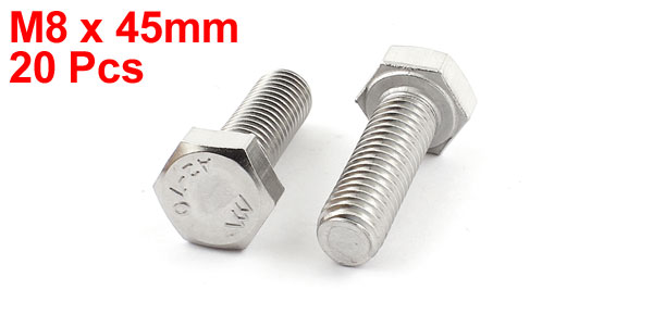 Product Name Hex Head Cap Screw Material A2-70 Stainless Steel Type M8 x 45mm Thread Dia 8mm/ 0.31"(M8) Thread Length 25mm / 1.0" Head Dia 15mm / 0.59" Color Silver Tone Weight 274g Package Content 20 x Hex Head Cap Screw - Reviews