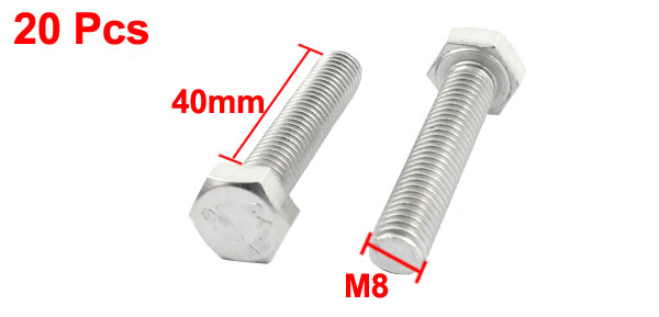 Product Name Hex Head Cap Screw Material A2-70 Stainless Steel Type M8 x 40mm Thread Dia 8mm/ 0.31"(M8) Thread Length 40mm / 1.6" Head Dia 15mm / 0.59" Color Silver Tone Weight 363g Package Content 20 x Hex Head Cap Screw - Reviews