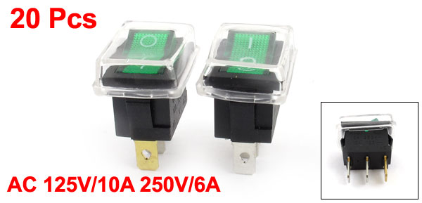 Main Color Black, Green Brand DMiotech Country of Manufacture CHINA Model KCD1 Voltage/Current AC 125V/10A 250V/6A Material Plastic, Metal Product Name Waterproof Rocker Switch Net Weight 108g Positions Number 2 Total Size(Each) 25 x 30 x 18mm/ 1" x 1.2" x 0.7"(L*W*H) Package Content 20 x Waterproof Rocker Switches Light Color Green Connection Type SPST - Reviews