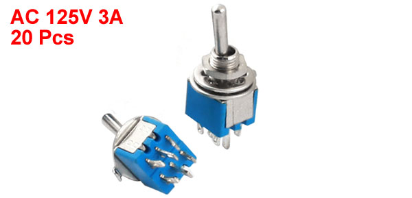 Product Name Toggle Switch Type DPDT (Latching) Position 2 Positions(ON/ON) Voltage, Current AC 125V 3A Mounting Thread Diameter 6mm / 0.24" Body Size 10 x 8 x 7mm / 0.4" x 0.31" x 0.28" (L*W*H) Total Height 28mm/ 1.1" Weight 65g Package Content 20 x Toggle Switch - Reviews