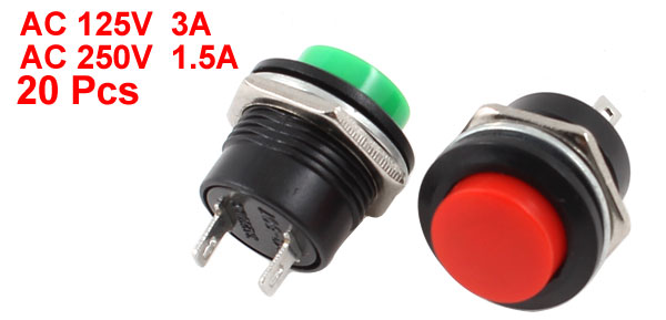 AC250V 1.5AButton Shape Round Shaped Button Diameter 13mm/0.51" Mounting Diameter 16mm/0.63" Total Size 25 x 22mm/1" x 0.87"(H* Max.D) External Material Plastic, Metal Color Green, Red, Black Net Weight 107g Package Content 20 x Push Button Switches - Reviews