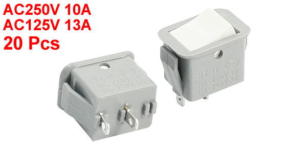 Product Name Rocker Switch Model MJ-11 Poles SPST Action Type Latching Terminals 2 Pin (On-Off) Rating Voltage AC250V 10A, AC125V, 13A Total Size(Each One) 19 x 12 x 20mm/ 0.75" x 0.47" x 0.8"(L*W*T) Mounting Size 18 x 11mm/ 0.71" x 0.43"(L*W) Body Color Gray Button Color White Material Plastic, Metal Weight 45g Package Content 20 x Rocker Switches - Reviews
