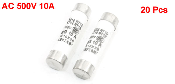 Product Name Ceramic Fuse Link Model No. R015 RT19 RT14 RT18 Type Fast Blow Rated Voltage 500V Rated Current 10A Specification 10mm x 38mm Diameter 10mm / 0.39" Length 38mm / 1.4" Quantity 20 Material Ceramic Main Color White, Silver Tone Total Weight 116g Package Content 20 Pcs x Ceramic Fuse Link - Reviews