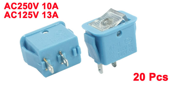 Product Name Rocker Switch Model MJ-11 Poles SPST Action Type Latching Terminals 2 Pin (On-Off) Rating Voltage AC250V 10A, AC125V, 13A Total Size(Each One) 19 x 12 x 21mm/ 0.75" x 0.47" x 0.83"(L*W*T) Mounting Size 17 x 11mm/ 0.67" x 0.43"(L*W) Color Blue Material Plastic, Metal Weight 44g Package Content 20 x Rocker Switches - Reviews