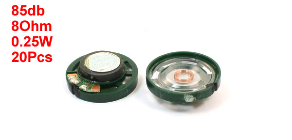 Product Name Toy Speaker Harmonic Distortion 3 DB 85db Type Electrodynamic Type Frequency Response 250-25000 Frequency Characteristic Full Spectrum Band Resistance 8Ohm Rated Power 0.25W Diameter 27mm/ 1.1" Material Copper, Aluminum, Plastic Main Color Silver Tone, Dark Green, Black,Clear, Copper Total Weight 133g Package 20 x Toy Speakers - Reviews