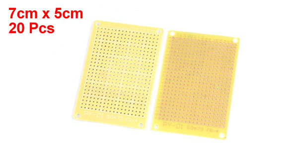 Product Name Universal PCB Board Hole Dia(Approx) 1mm / 0.04" Hole Pitch(Approx) 3mm / 0.12" Size(Approx) 7 x 5cm / 2.8" x 2.0"(L*W) Thickness(Approx) 1mm / 0.04" Color Yellow, Brown, Copper Tone Material Glass Fiber, Copper Net Weight 86g Package Content 20 x Universal PCB Board - Reviews