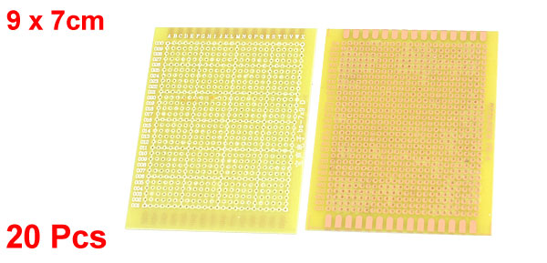 Product Name Universal PCB Board Hole Dia(Approx) 1mm / 0.04" Hole Pitch(Approx) 3mm / 0.12" Size(Approx) 9 x 7cm / 3.5" x 2.8"(L*W) Thickness(Approx) 1mm / 0.04" Color Yellow, Brown, Copper Tone Material Glass Fiber, Copper Net Weight 175g Package Content 20 x Universal PCB Board - Reviews