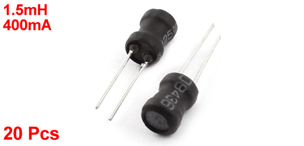 Product Name Inductor Inductance 1.5mH Rating Current 400mA Tolerance 10% Body Size 6 x 8mm / 0.24" x 0.31"(D*H) Pin Size 0.5 x 14mm/ 0.02" x 0.55"(D*L) Lead Distance 2mm / 0.08" Color Black, Silver Tone Weight 20g Package Content 20Pcs x Inductors - Reviews