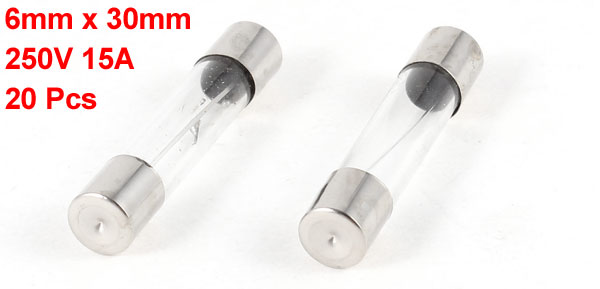 Product Name Glass Tube Fuses Features Fast Blow(F), Low Breaking Capacity(L) Rated Voltage 250V Rated Current 15A Specification 6mm x 30mm Diameter 6mm / 0.236" Length 30mm / 1.181" Material Glass, Metal Color Clear Weight 24g Package 20 x Glass Tube Fuses - Reviews