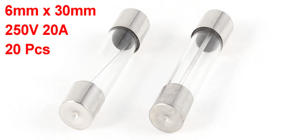 Details20pcs Fast Blow Glass Tube Fuse 20A 250V 6mm x 30mm  Product Name Glass Tube Fuses Features Fast Blow(F), Low Breaking Capacity(L) Rated Voltage 250V Rated Current 20A Specification 6mm x 30mm Diameter 6mm / 0.236" Length 30mm / 1.181" Material Glass, Metal Color Clear Weight 24g Package 20 x Glass Tube Fuses