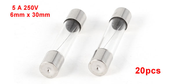 Product Name Glass Tube Fuses Features Fast Blow(F), Low Breaking Capacity(L) Rated Voltage 250V Rated Current 5A Specification 6mm x 30mm Diameter 6mm / 0.236" Length 30mm / 1.181" Material Glass, Metal Color Clear Weight 21g Package 20 x Glass Tube Fuses - Reviews