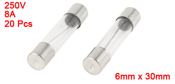 Product Name Glass Tube Fuses Features Fast Blow(F), Low Breaking Capacity(L) Rated Voltage 250V Rated Current 8A Specification 6mm x 30mm Diameter 6mm / 0.236" Length 30mm / 1.181" Material Glass, Metal Color Clear Weight 24g Package 20 x Glass Tube Fuses - Reviews